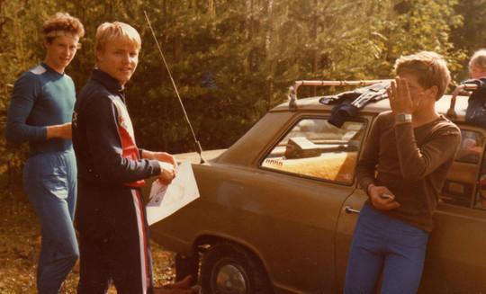 Maisemasta päätellen Vaalassa 1982. Jaoston puheenjohtaja ja suunnistaja Pekka Ukkola, suunnistajat Tapio Pussinen ja Maarit Kurkela sekä monet matkat kuskannut Veli Kurkela.
