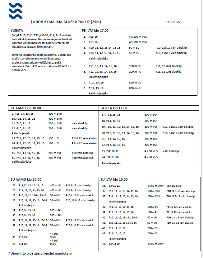 Lauantaina klo 10.00, verryttely 8.30-9.50. LAJI 9 - 16